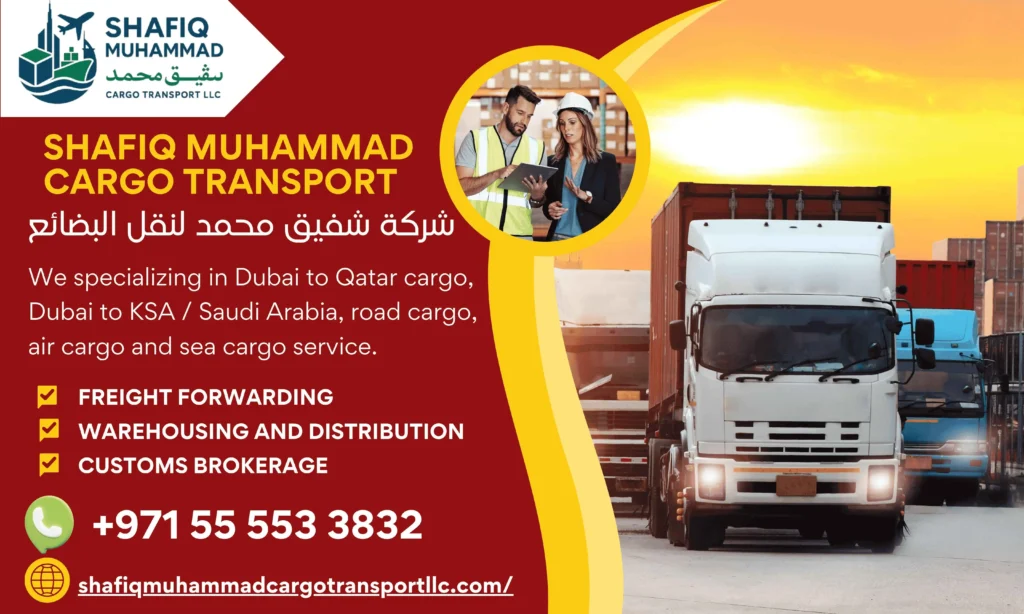 SHAFIQ MUHAMMAD CARGO TRANSPORT LLC offers the best cargo services in Dubai, specializing in Dubai to Qatar cargo, Dubai to KSA / Saudi Arabia, road cargo, air cargo and sea cargo service. As a trusted Dubai cargo company, we provide freight forwarding, door-to-door cargo and international shipping solutions with reliability.
